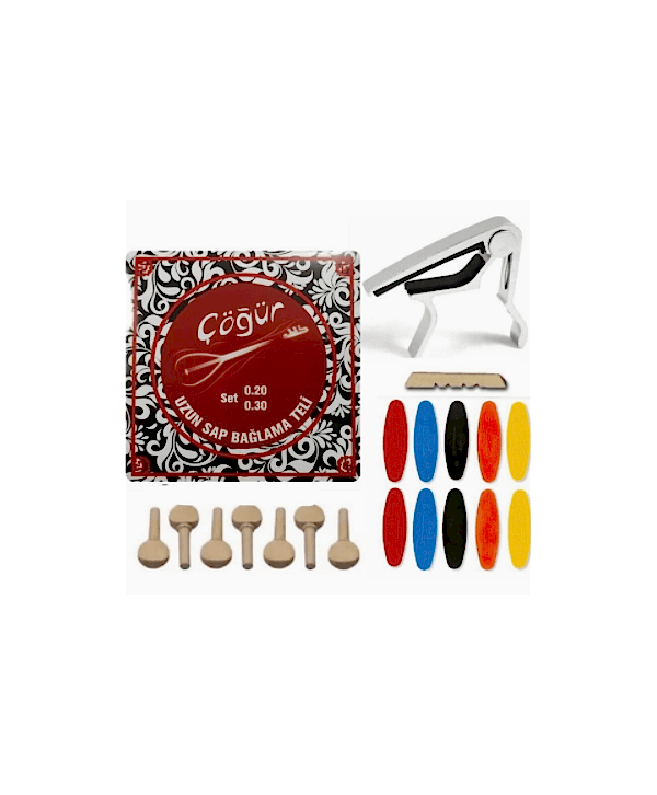 1 takım çöğür marka uzun sap bağlama teli + metal capo ( kelepçe ) + 7 adet ağaç burgu + 10 adet çift taraflı numaralı tezene + 1 adet eşik