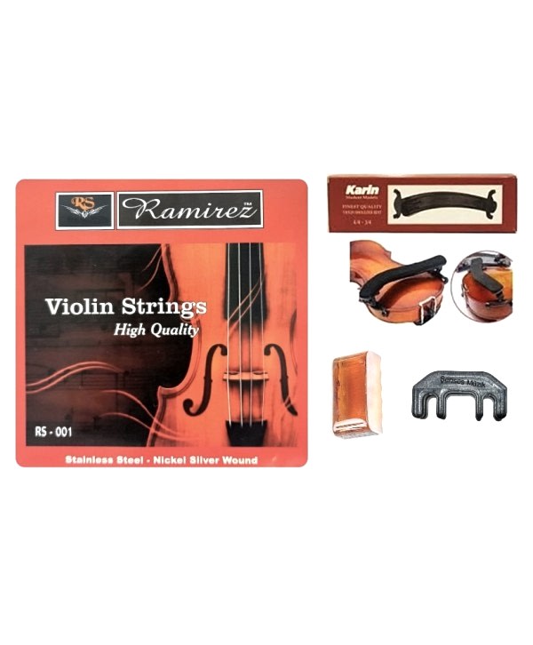 1 Takım Ramirez Marka Keman Tel Seti ( Alt Mi(E) teli paslanmaz çelik diğer Re, La ve Sol telleri ise çelik çekirdekli nikel kaplamalı gümüş sarımlı tellerdir.) + Bir Adet Karin Marka Ayarlanabilir 3/4 & 4/4 Uyumlu Keman Yastığı + Bir Adet 4 Dişli Renkli Keman Susturucu + Bir Adet Ağaç Sandıklı Profesyonel Reçine Hepsi Bir Arada. Bu Ürün Şenses Müzik Tarafından Hazırlanmıştır.