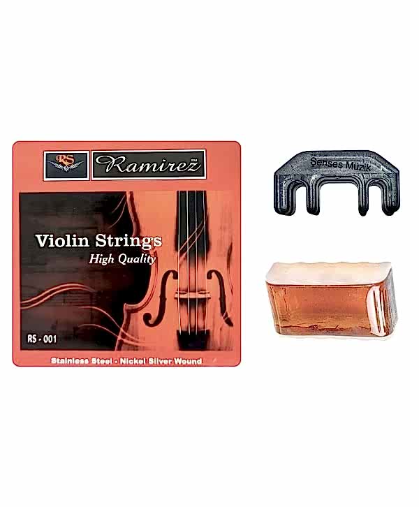 1 Takım Ramirez Marka Keman Tel Seti ( Alt Mi(E) teli paslanmaz çelik diğer Re, La ve Sol telleri ise çelik çekirdekli nikel kaplamalı gümüş sarımlı tellerdir.) + Bir Adet 4 Dişli Renkli Keman Susturucu + Bir Adet Ağaç Sandıklı Profesyonel Reçine Hepsi Bir Arada. Bu Ürün Şenses Müzik Tarafından Hazırlanmıştır.