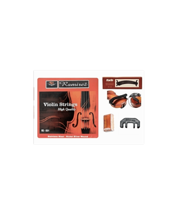 1 Takım Ramirez Marka Keman Tel Seti ( Alt Mi(E) teli paslanmaz çelik diğer Re, La ve Sol telleri ise çelik çekirdekli nikel kaplamalı gümüş sarımlı tellerdir.) + Bir Adet Karin Marka Ayarlanabilir 3/4 & 4/4 Uyumlu Keman Yastığı + Bir Adet 4 Dişli Renkli Keman Susturucu + Bir Adet Ağaç Sandıklı Profesyonel Reçine Hepsi Bir Arada. Bu Ürün Şenses Müzik Tarafından Hazırlanmıştır.