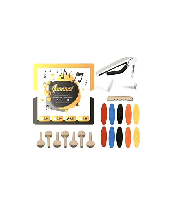 1 takım şenses marka uzun sap bağlama teli ( 50 tekneye kadar bam bam teli dahil ) + metal capo ( kelepçe ) + 7 adet ağaç burgu + 10 adet çift taraflı numaralı tezene + 1 adet eşik (%100 müşteri memnuniyeti